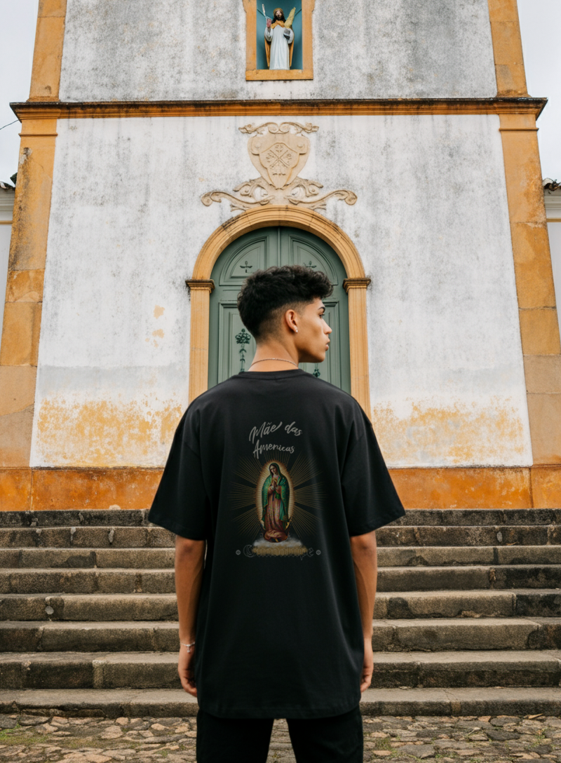 A camiseta oversized "Virgem de Guadalupe" homenageia a aparição mariana que tocou o coração de um continente inteiro. Um símbolo de amor, proteção e presença materna que atravessa séculos — e agora pode ser vestida com fé e atitude.